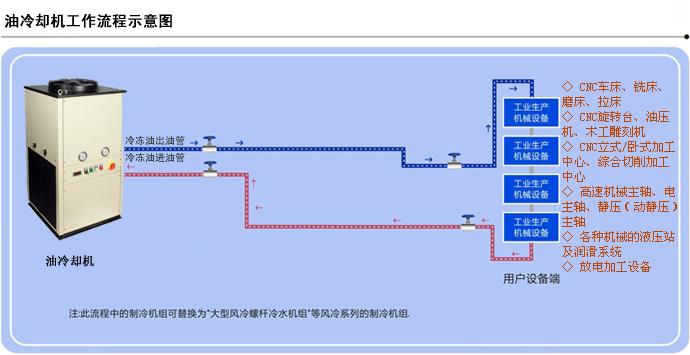 二、油冷機(jī)分類(lèi): 1、帶油箱式油冷機(jī),油冷機(jī)組內(nèi)部配有油箱和油泵,在油冷機(jī)工作前必須要先把油箱注滿冷卻油,加入油箱的油由客戶選定,主要還是看客戶的設(shè)備所需要用什么品質(zhì)和標(biāo)號(hào)的油,一般為冷卻液,主要給加工中心主軸冷卻機(jī)。