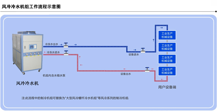 二、冰水機(jī)分類: 1、按冷凝器的種類分:水冷型冰水機(jī)[1]和風(fēng)冷型冰水機(jī)兩種。 1-1、水冷型:冰水機(jī)外接冷卻水(需要安裝冷卻塔),將冷凝器中冷媒的熱量帶走。 水冷型冰水機(jī)具有壽命長,效率高,噪音低等特點(diǎn),適合一些特定的環(huán)境及場所使用。 1-2、風(fēng)冷型:冰水機(jī)裝有散熱風(fēng)扇,通過風(fēng)扇吸風(fēng)將冷凝器中冷媒的熱量帶走。 風(fēng)冷型冰水機(jī)具有安裝方便簡單,移動(dòng)方便。但噪音比較大。效率比水冷型冰水機(jī)略差。 2. 按蒸發(fā)器的種類分:沉水式和殼管式(板換式)兩種。 2-1、沉水式:將蒸發(fā)器的銅管圈在水箱中實(shí)現(xiàn)制冷,水泵從水箱中抽水實(shí)現(xiàn) 循環(huán)。(特征:先制冷,后抽水) 2-2、殼管式:殼管式也叫板換式,把蒸發(fā)器做成一個(gè)長筒型罐子(或者用板式換熱器),水泵從水箱抽水注入蒸發(fā)器實(shí)現(xiàn)制冷。(特征:先抽水,后制冷) 2-3、按蒸發(fā)器的類型分,還有一些特殊用途的冷水機(jī):因被冷卻的物 質(zhì)具有腐蝕性或者被冷卻物質(zhì)潔凈度要求比較高,它的蒸發(fā)器用 不銹鋼材料或者用塑膠+鈦管制成(電鍍行業(yè)),船用冰水機(jī) (黃銅管+塑膠),食品、化妝品行業(yè)就要求潔凈度較好的冰水機(jī)。 3. 分體式冰水機(jī):根據(jù)有些客戶又想使用風(fēng)冷型冷水機(jī)因?yàn)榘惭b方便,又想噪音低,只有選用分體式冰水機(jī),把風(fēng)扇部分與主機(jī)部分拆分,放在室外(有點(diǎn)像家用的空調(diào)形式)。這樣就可以達(dá)到噪音低又可以便宜風(fēng)冷型冰水機(jī)。 4、開放式冰水機(jī):開放式冰水機(jī)只是水冷型冰水機(jī)的一種,就是把水冷型冰水機(jī)的外殼去掉這樣就可以更加地節(jié)省成本,把水箱放在開放式冰水機(jī)的邊上,但需要安裝兩臺(tái)循環(huán)水泵,一臺(tái)內(nèi)循環(huán)一臺(tái)外循環(huán)水泵。 三、冰水機(jī)應(yīng)用領(lǐng)域: 1、用用于食品,醫(yī)藥領(lǐng)域 2、應(yīng)用于橡膠,塑膠,加工機(jī)械成型模具冷卻,能夠大大提高塑料制品表面光潔度,減少塑料制品表面紋痕和內(nèi)應(yīng)力,使產(chǎn)品不縮水、不變形,便于塑料制品的脫模,加速產(chǎn)品定型,從而極大地提高塑料成型機(jī)的生產(chǎn)效率; 3、應(yīng)用于數(shù)控機(jī)床、坐標(biāo)鏜床、磨床、加工中心、組合機(jī)床以及各類精密機(jī)床主軸潤滑和液壓系統(tǒng)傳動(dòng)媒的冷卻,能夠精確地控制油溫,有效地減少機(jī)床的熱變形,提高機(jī)床的加工精度。 4、應(yīng)用于化工行業(yè)、中央空調(diào)等領(lǐng)域。